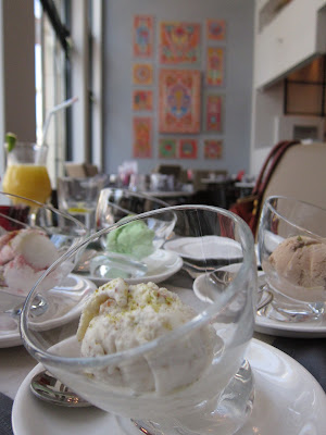 Now, after enjoying around eight different specialties, you would think we should skip on dessert, right?! NOPE, we went right ahead and did our due diligence to the numerous suggested sweets.....and I'm SO glad we did. The waiter first placed a colorful array of ice cream bowls down on the table. We had everything from strawberry, to a pistachio mint, and even a pistachio cardamom flavor! All are house-made and tasted as fresh as they looked. My favorite was the pistachio cardamom flavor similar to a kulfi, but a little less dense. The main difference between kulfi and ice cream is the method of how it's frozen. Ice cream is air-rated where kulfi is not, giving each a different texture.